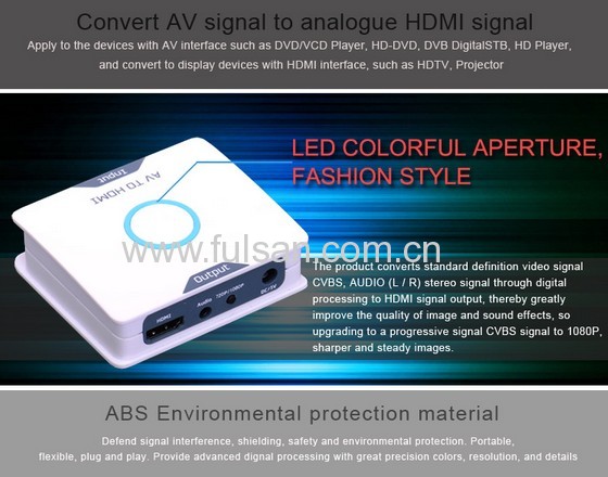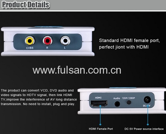 Build-in 3D digital decoder, AV TO HDMI converter can convert 480I(NTSC)/576I(PAL) format signal to 720P/1080P HDMI signal output, Easy connect the DVD, set-top box, HD player, Game Console (PS2,PS3,PSP,WII,XBOX360 etc).