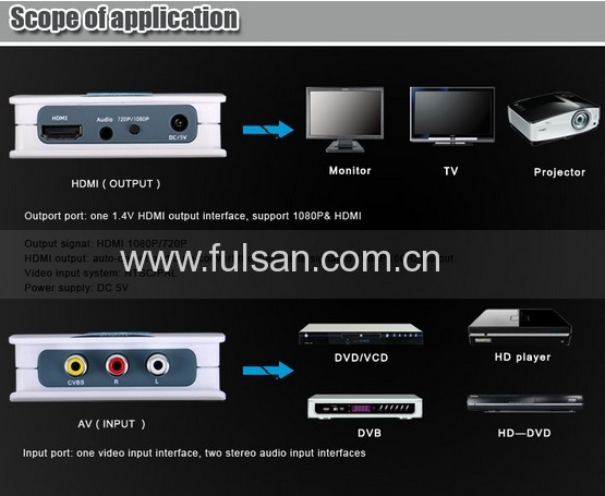 Application: Apply to convert devices with audio and video signal,such as DVD, HD Player, PS2, PS3, PSP, XBOX360; to devices with HDMI signal, such as Computer, DVD, TV,ect.