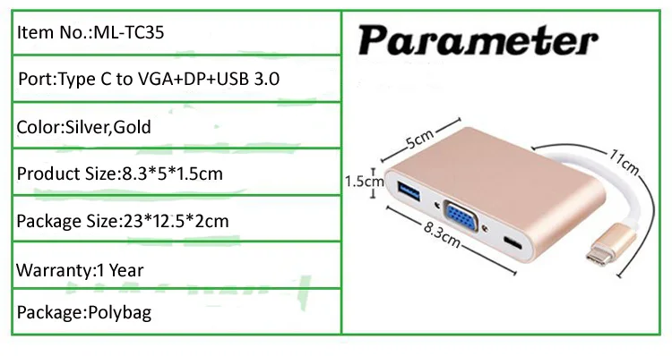 | Product Name | Type C to VGA+USB 3.0+DP |