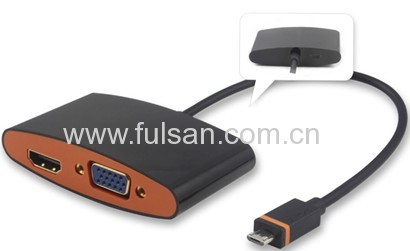 MYDP(SlimPort) to VGA+HDMI is one of video transmission with power supply.The highest transmission rate of MYDP input can up to 5.4Gbps.Input device including LG G2 mobile phone(Android system).PS:The HDMI port supports HK NEXUS 7 tablet PC(Andorid system).Both HDMI and VGA output supports 1920*1080P@60HZ resolution.Output device including HDTV,monitor.The VGA and HDMI cannot insert together.If you insert them in the same time ,the HDMI signal will output preferentially.