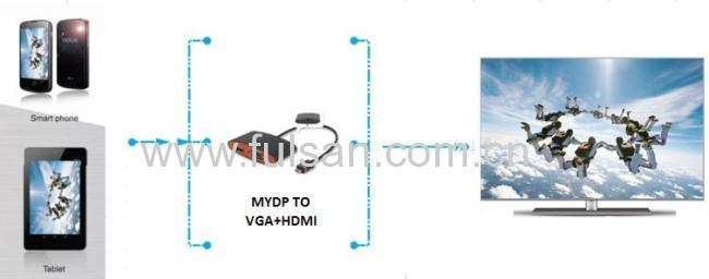 MYDP(SlimPort) to VGA+HDMI is one of video transmission with power supply.The highest transmission rate of MYDP input can up to 5.4Gbps.Input device including LG G2 mobile phone(Android system).PS:The HDMI port supports HK NEXUS 7 tablet PC(Andorid system).Both HDMI and VGA output supports 1920*1080P@60HZ resolution.Output device including HDTV,monitor.The VGA and HDMI cannot insert together.If you insert them in the same time ,the HDMI signal will output preferentially.